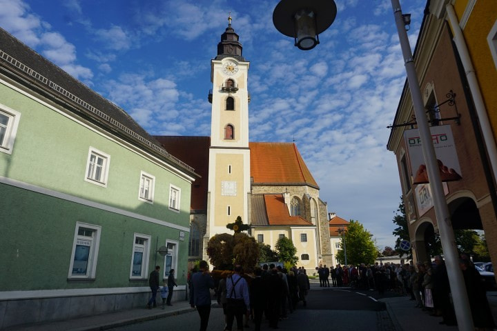 Maria Traunmüller bedankt sich bei den Ortschaften Ober- und Unterschaden, Altau, Taubenbrunn, Wörth und Goldenberg für das Ausrichten des Festes, besonders für das Gestalten des Schmuckes und dem Herstellen der wunderschönen Erntekrone.