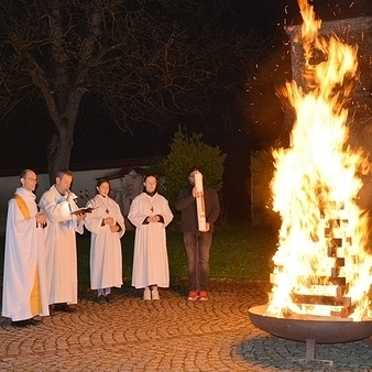 Zu bombastischen Klängen von "Chariots of Fire" zogen in der dunklen Osternacht die Zelebranten, Lektoren und Ministrant:innen in den Pfarr-Innenhof zum lodernden Osterfeuer, wo die Osterkerze entzündet wurde.
