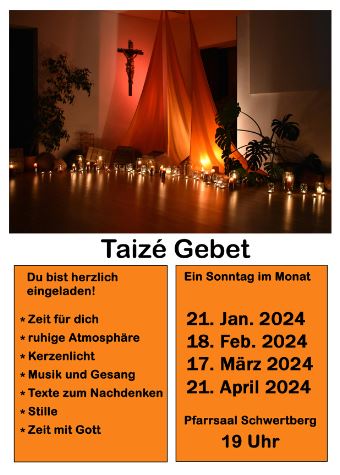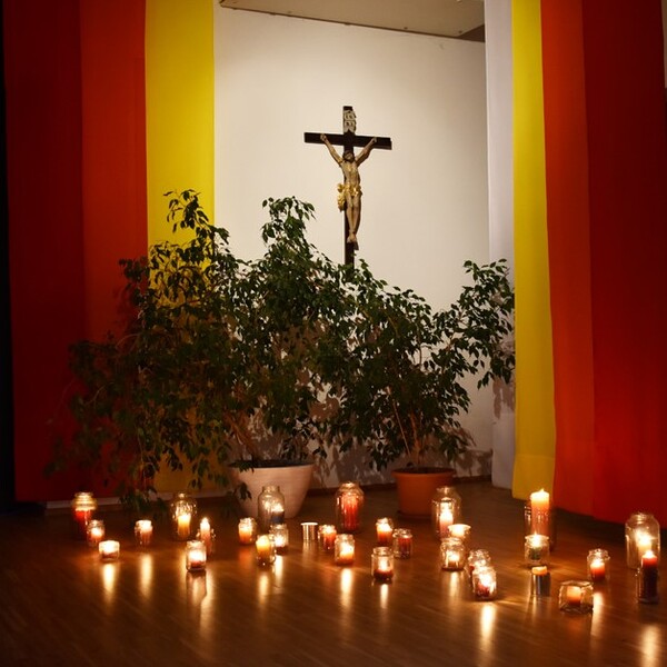 Ein Dekorationsteam bemüht sich, nach dem Vorbild der Kirche in Taizé, im Pfarrsaal Schwertberg einen inspirierenden Rahmen zu schaffen. Die Mitfeiernden sind eingeladen, bei Kerzenlicht zur Ruhe zu kommen und das tragende Gefühl des gemeinsamen Singens und Betens zu genießen.