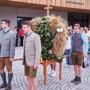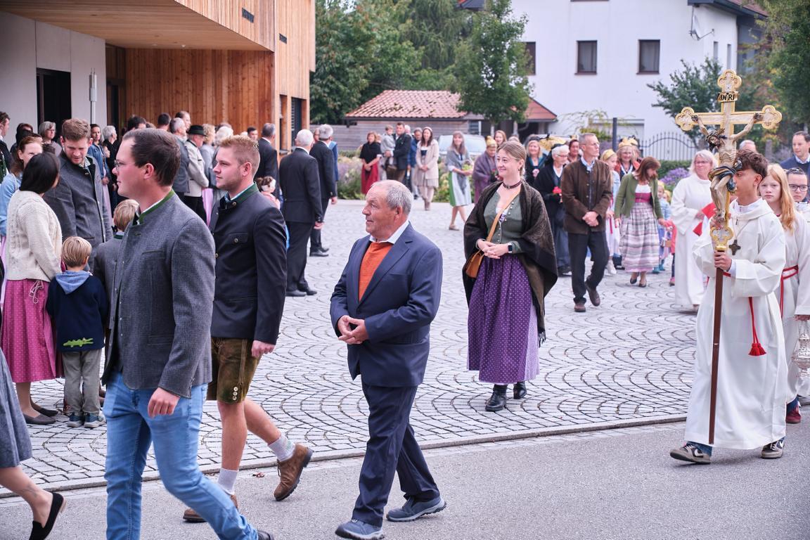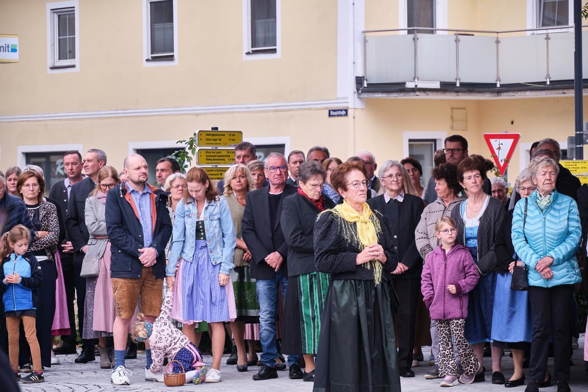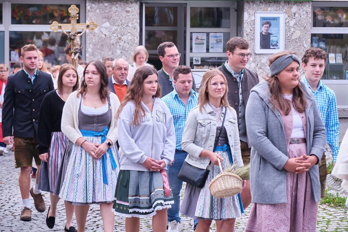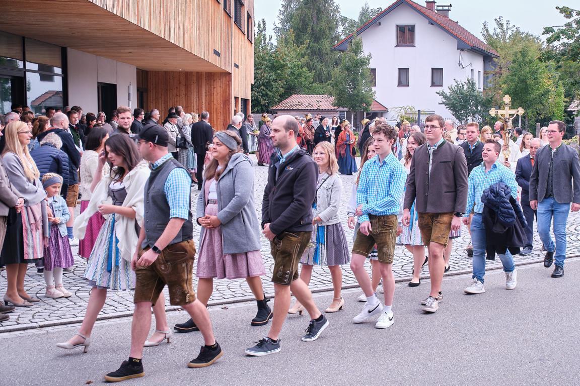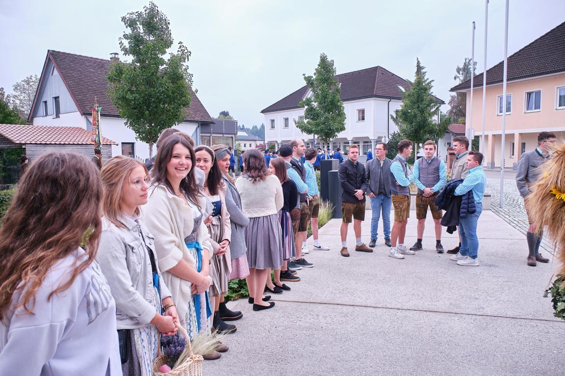 Am letzten Sonntag im September feierte die Pfarrgemeinde das Erntedankfest. Beginn war beim Gemeindeamt, wo Seelsorgeverantwortliche Irmgard Raffetzeder alle  sehr herzlich zum Fest begrüßte und Pfarrer Johann Greinegger die Erntekrone segnete, die von der Landjugend so schön gebunden wurde. Anschließend geleitete die Marktmusikkapelle den Festzug mit den Prangerschützen, den Goldhaubenfrauen, der Landjugend und den Erstkommunionkindern, Vertretern des PGRs und der politischen Gemeinde und ganz vielen Mitfeiernden in die Pfarrkirche zum Festgottesdienst mit unserem Kirchenchor. In der Predigt führte Pfarrer Greinegger aus, warum wir dreifachen Grund zum Danken haben: Für unsere tägliche Versorgung mit Lebensmittel, die uns in solcher Fülle zur Verfügung stehen, wie kaum einer Generation vor uns, für unsere Mitmenschen und alles, was wir durch sie erfahren dürfen, und für die Begegnung mit Gott am Altar in der Mitte unserer Pfarrkirche.